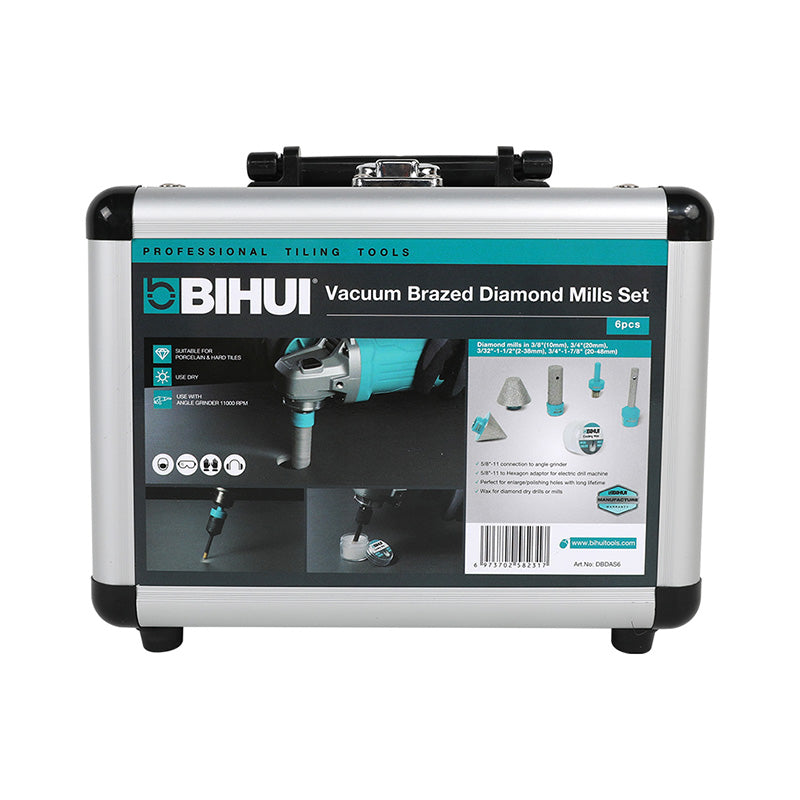 Frese diamantate altamente resistenti all'usura . Le frese diamantate vengono utilizzate per l'allargamento di fori in gres porcellanato, granito, marmo e ceramica dura, con la superficie di lavoro laterale rettificata . Le frese diamantate BIHUI Dry Gres sono prodotte utilizzando la tecnologia delle particelle di diamante legate sotto vuoto, che aumenta la resistenza alle alte temperature e all'attrito e prolunga significativamente la durata delle punte. Le frese diamantate BIHUI Dry Gres vengono montate direttamente su una smerigliatrice angolare con filettatura M14 o su un trapano a batteria tramite adattatore. La velocità massima di esercizio è di circa 14.000 giri/min.