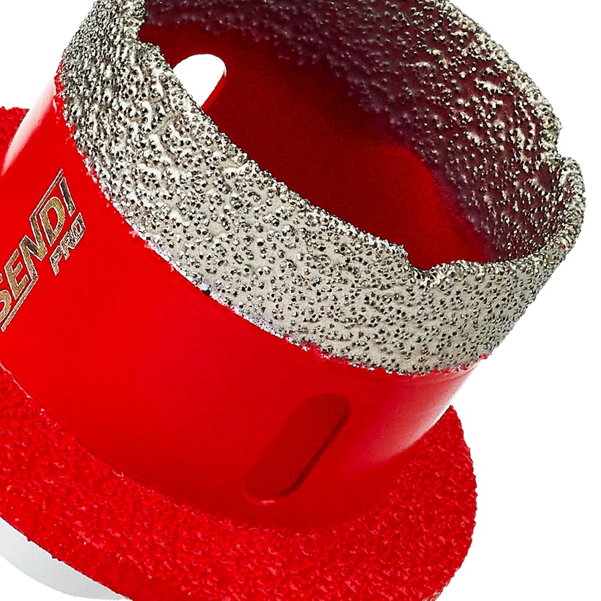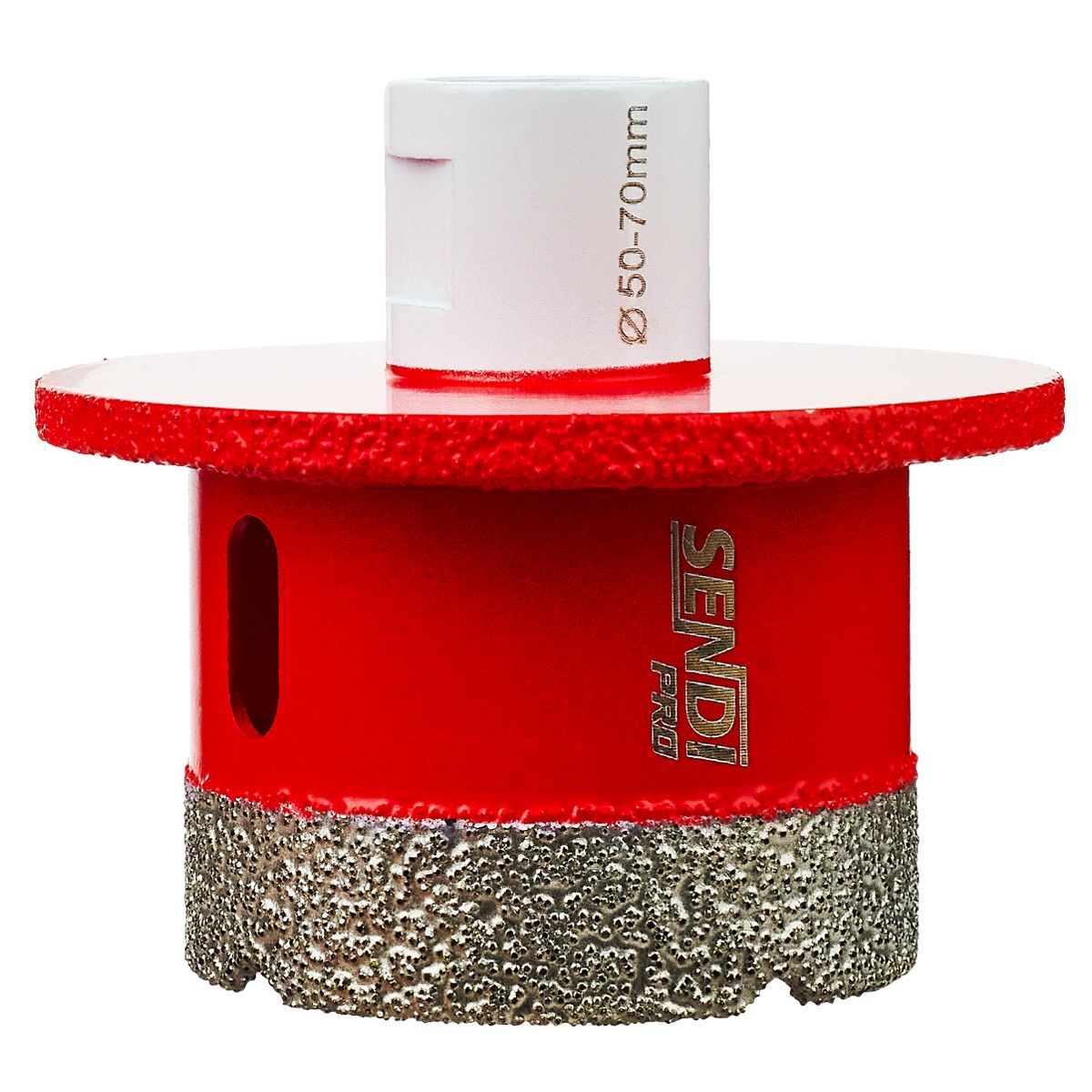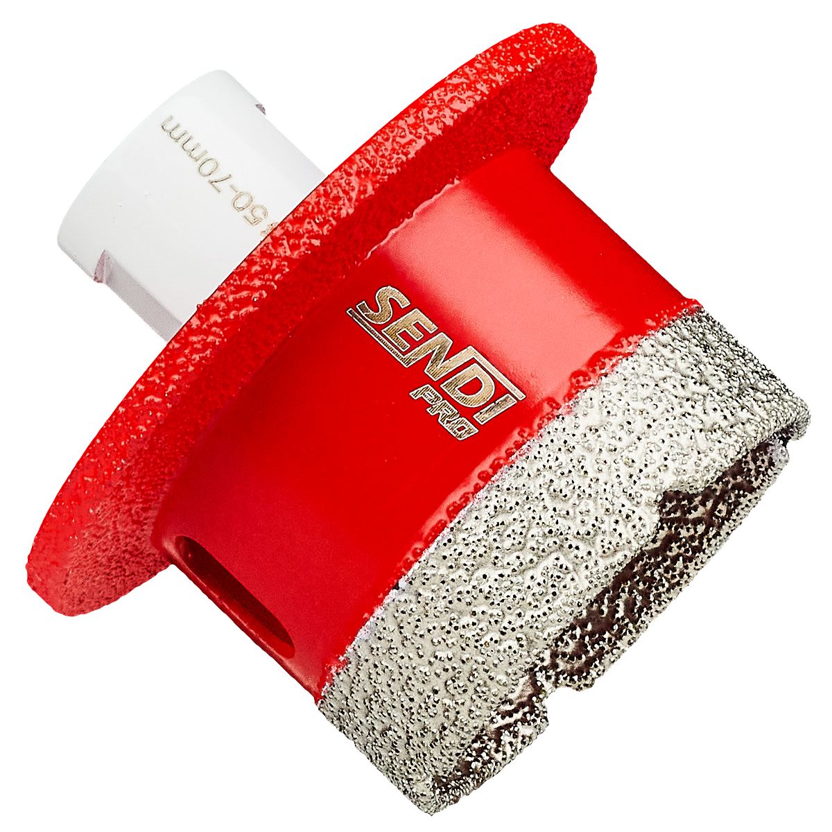 La fresa diamantata professionale SENDI PRO da 50-70 mm è progettata per la fresatura di fori in lavelli e vasche in pietra naturale, ceramica e gres. La punta, realizzata con tecnologia di brasatura sotto vuoto, consente una foratura più rapida nei materiali duri, offre una maggiore resistenza al surriscaldamento e garantisce una lunga durata. La fresa è dotata di un attacco M14 per smerigliatrici angolari ed è progettata principalmente per lavori a secco.