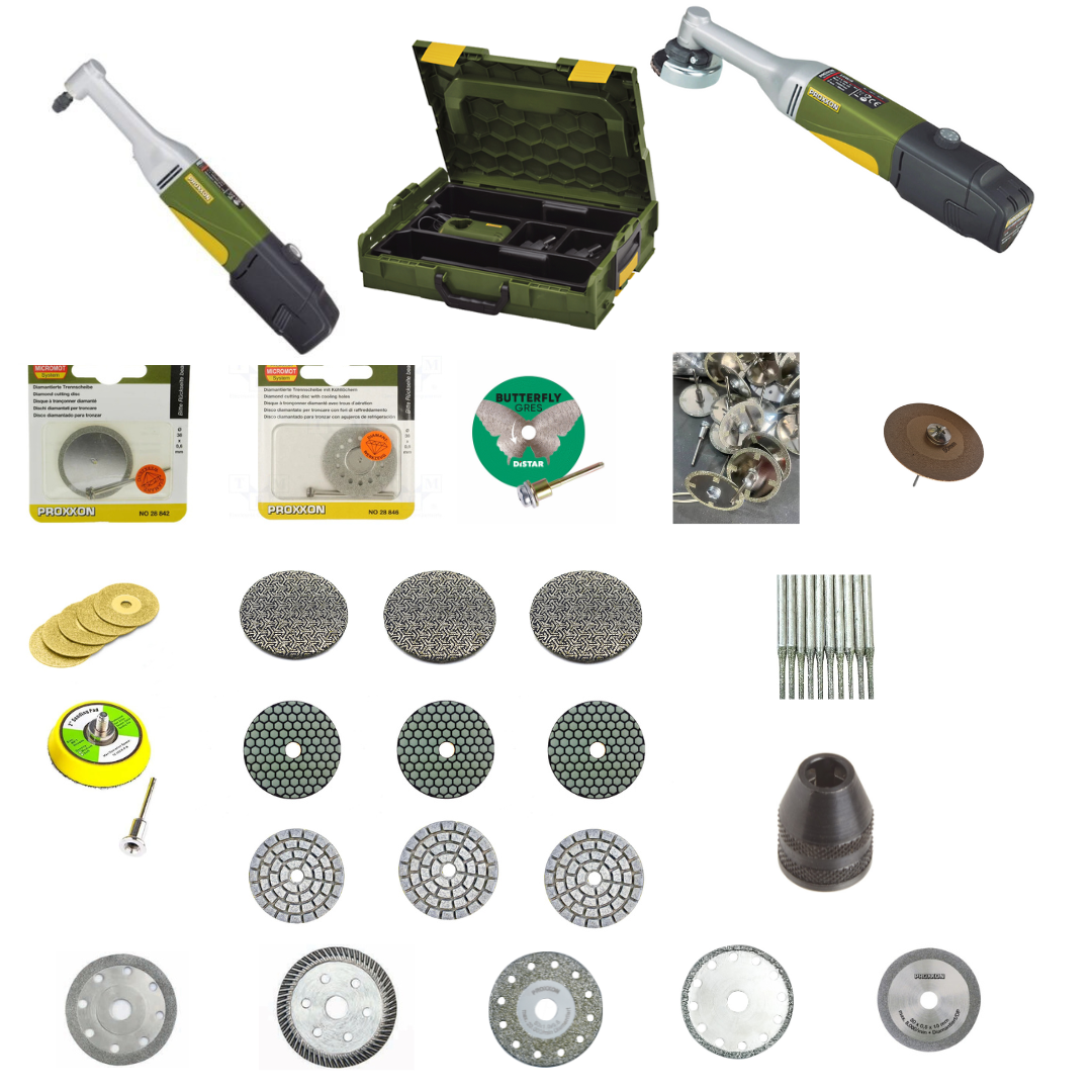 Questo kit è stato progettato per la lavorazione di materiali ceramici e gres porcellanato, includendo strumenti e accessori specifici per il taglio e la finitura.