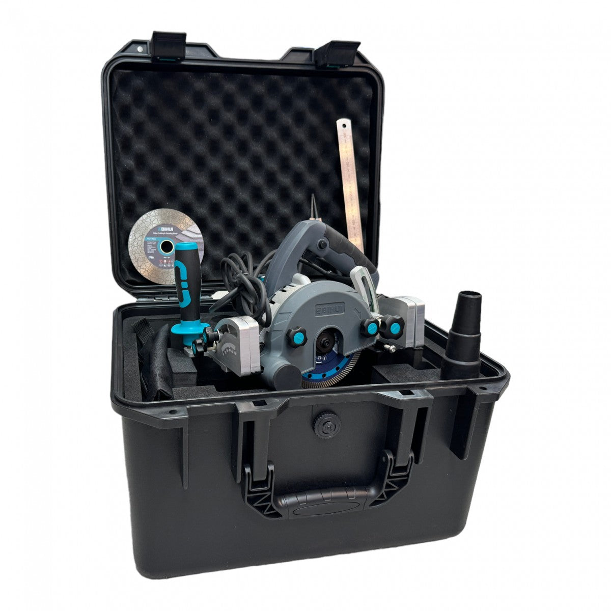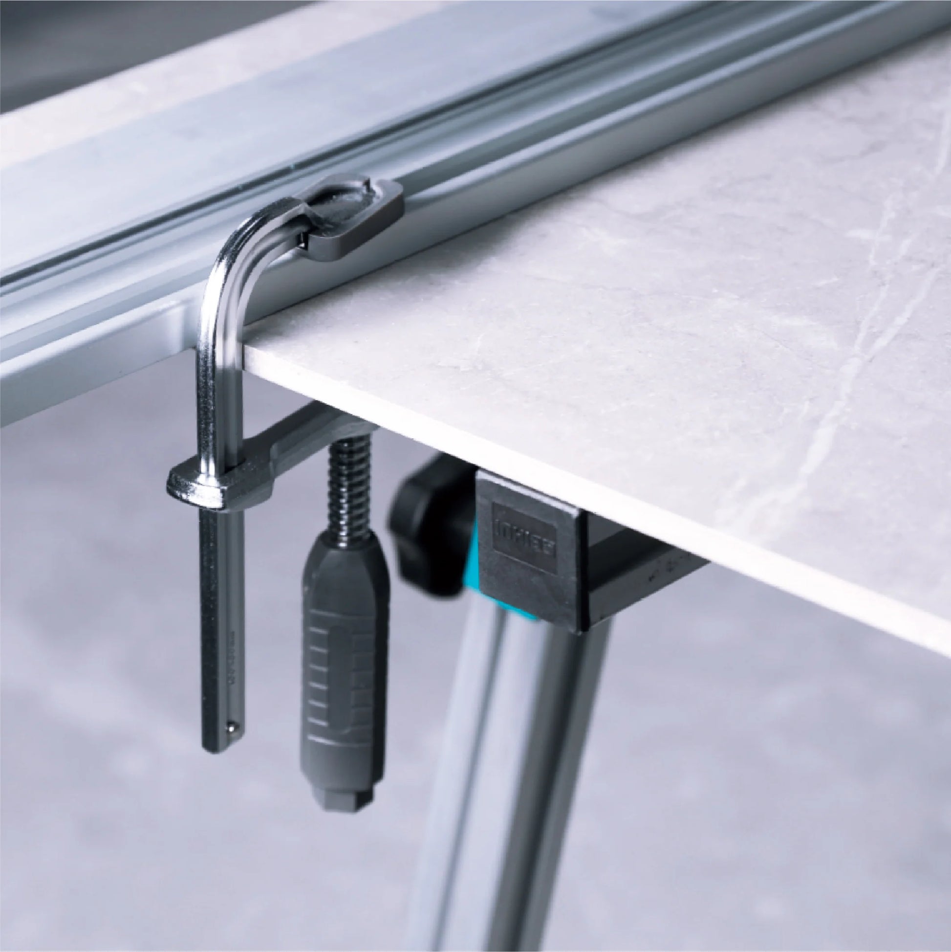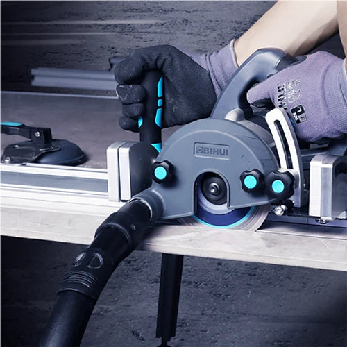 Sistema elettrico di taglio per piastrelle di grande formato BIHUI di quinta generazione SENZA binari . Progettato appositamente per il taglio di tutti i tipi di piastrelle in ceramica, pietra naturale e artificiale (ad esempio gres porcellanato, marmo, agglomerato di quarzo). Il taglio preciso è garantito dall'alta qualità del carrello, dalle guide in alluminio con telaio integrato in acciaio e dal loro sistema di collegamento. Il sistema include tutti gli elementi necessari per il taglio. È possibile acquistare una guida aggiuntiva e aumentare la lunghezza del taglio.