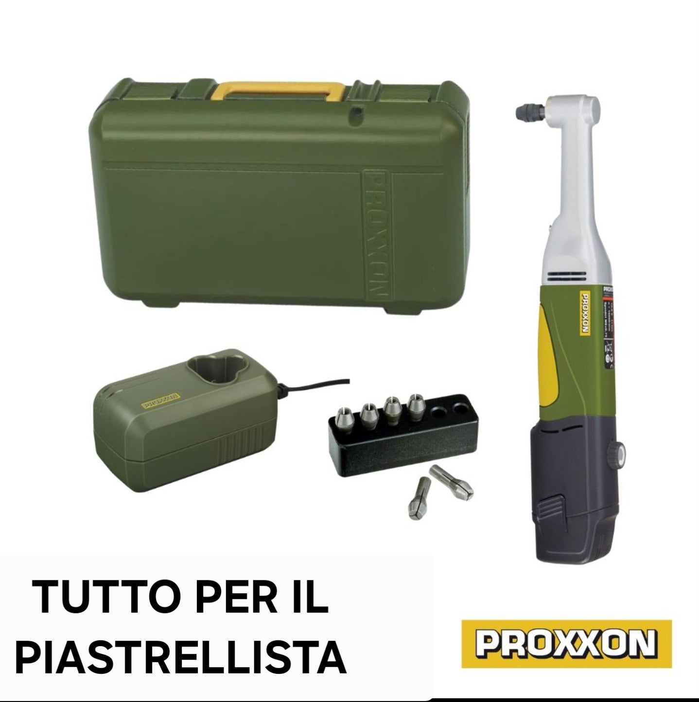 Trapano Smerigliatore Angolare a collo lungo, serie PROXXON MICROMOT, modello LWB/E (a batteria), strumento ideale per una vasta gamma di applicazioni, come forare, fresare, smerigliare, lucidare, pulimentare, troncare, incidere e marcare.
